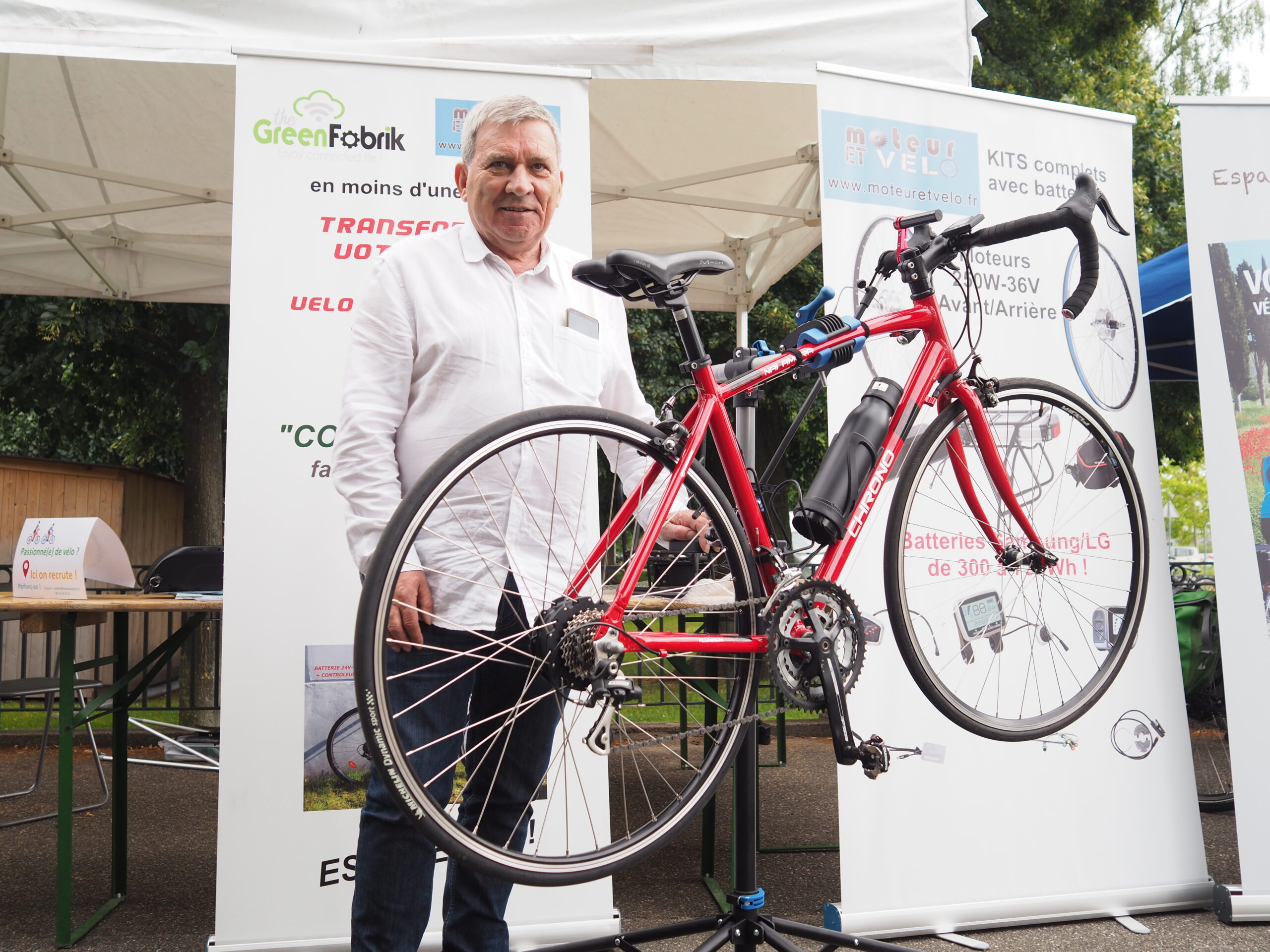 Lorsque les gens achètent un vélo électrique, personne ne les prévient que la batterie a une durée de vie limitée, en moyenne cinq ans, mais on peut voir le pire, 2 ans, comme le meilleur, 10. Qu’il y ait un nom américain ou japonais sur votre vélo, les batteries viennent de Chine. Dans la plupart des cas, on peut les reconditionner, on garde la boîte, les câblages et on assemble de nouvelles cellules sur mesure avec les mêmes caractéristiques électriques et électroniques pour faire avancer le vélo. Presta-Batterie est basée au Caire à Haguenau, depuis 7 ans. La seconde partie de mon activité, c’est www.moteuretvelo.fr qui vend des kits de transformation d’un vélo lambda en vélo électrique pour environ 800€. Un particulier qui sait démonter une roue peut facilement installer le kit, sinon il y a les revendeurs. La batterie peut être dissimulée dans le porte-bidon, et il y a un fil à tirer jusqu’au moteur de la roue arrière. Si l’on prend l’exemple d’un retraité qui s’est acheté un beau vélo, mais il a du mal à monter les côtes, et qui veut garder son vélo sur du plat, il sera emballé de savoir que mon moteur ne pèse que 4,1kg. C’est tout à fait acceptable pour compenser ses faiblesses…
