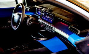 À bord, Lancia tente de conjuguer sport et praticité avec plus ou moins de bonheur. Si les sièges baquets revêtus de leur sellerie éco-nylon bleu racing affichent clairement leurs ambitions sportives tout en offrant un maintien latéral correct, l’ensemble de la présentation manque d’originalité. On retrouve ainsi la planche de bord de toutes les Stellantis de cette génération, simplement égayée par quelques inserts HF en dégradé bleu et rouge et l’éclairage d’ambiance 8 couleurs.