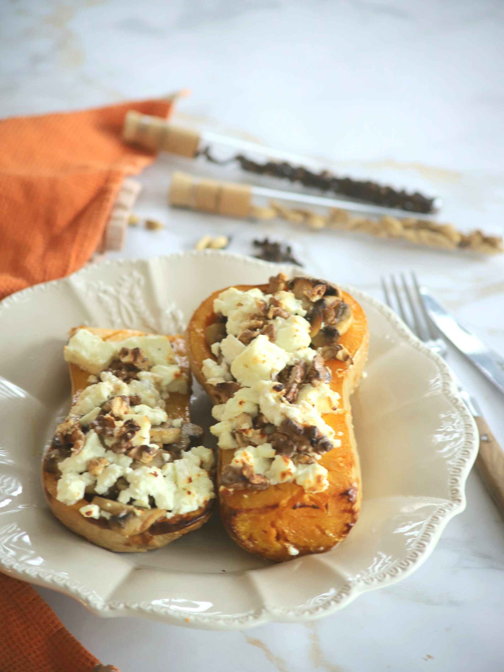 Sortez la butternut du four, garnissez là avec la farce, ajoutez la feta émiettée et les noix.