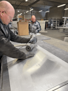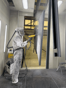 Chez Teracolor, l’unité de thermolaquage intégrée, le métal prend des couleurs et de la résistance en suivant un protocole précis : traitement de surface, poudrage électrostatique, puis cuisson au four à haute température. Cette prouesse technique donne à chaque pièce une finition parfaite, durable et sans entretien : un simple nettoyage au jet d’eau suffit.