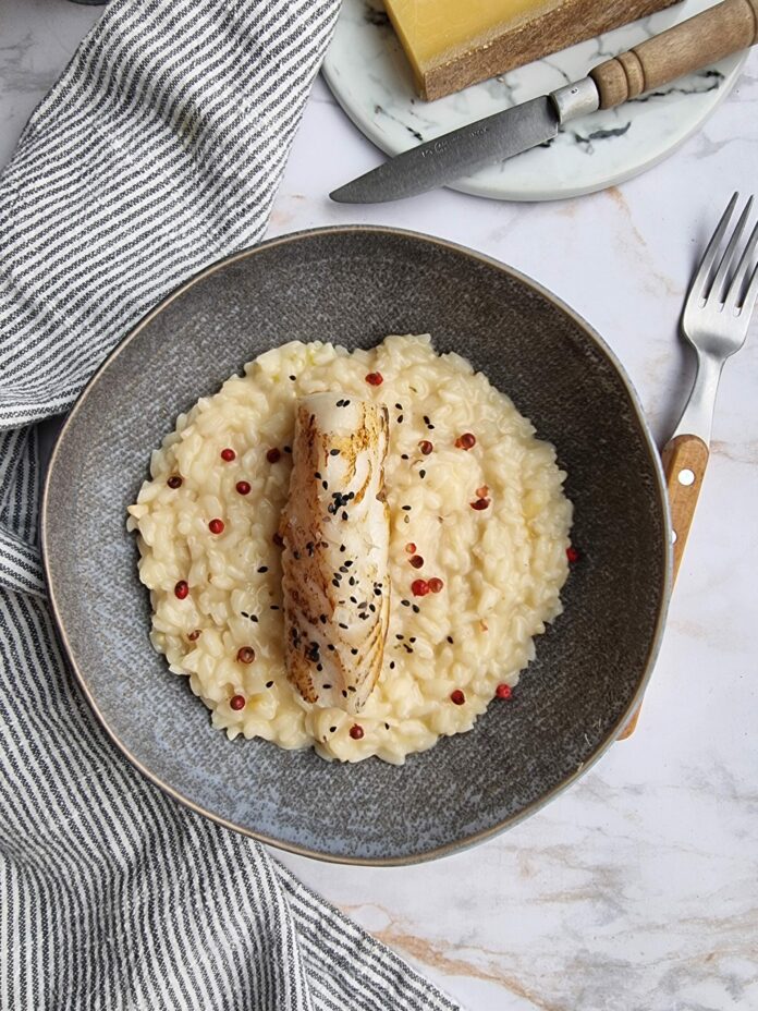Cinq minutes avant la fin de cuisson du risotto, faites revenir dans une poêle bien chaude avec de l’huile d’olive, les dos de cabillaud 5 minutes de chaque côté, salez et servir aussitôt.