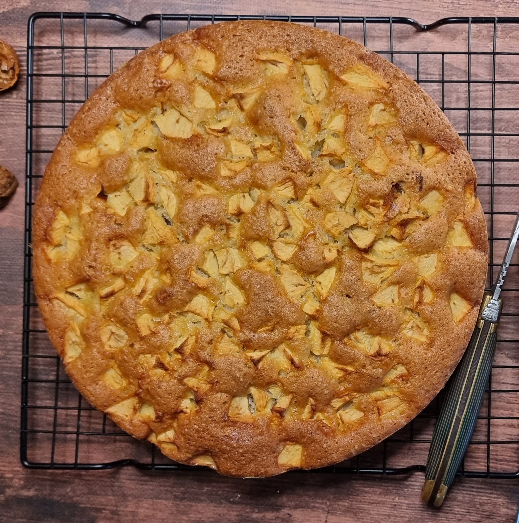 Beurrer et fariner un moule rond, verser la pâte, puis ajouter la troisième pomme en cubes sur le dessus pour un joli rendu.