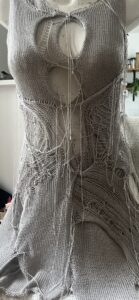Je travaille beaucoup l’expérimentation textile, avec des matières organiques comme la maille et le latex. Dans mon univers, il n’y a pas d’esprit haute couture très figé ; tout n’est pas parfaitement coupé ou fini. Mes vêtements sont organiques, en mouvement, presque vivants. J’aime le côté étiré, déchiré, réparé… Chaque pièce est unique. Je m’inspire du cinéma, de l’art, de la littérature, de tout ce qui touche à la tension du corps. Mon approche est plus proche de la sculpture textile que du patronage traditionnel. La maille, je la pense comme une deuxième peau, vulnérable et forte à la fois.