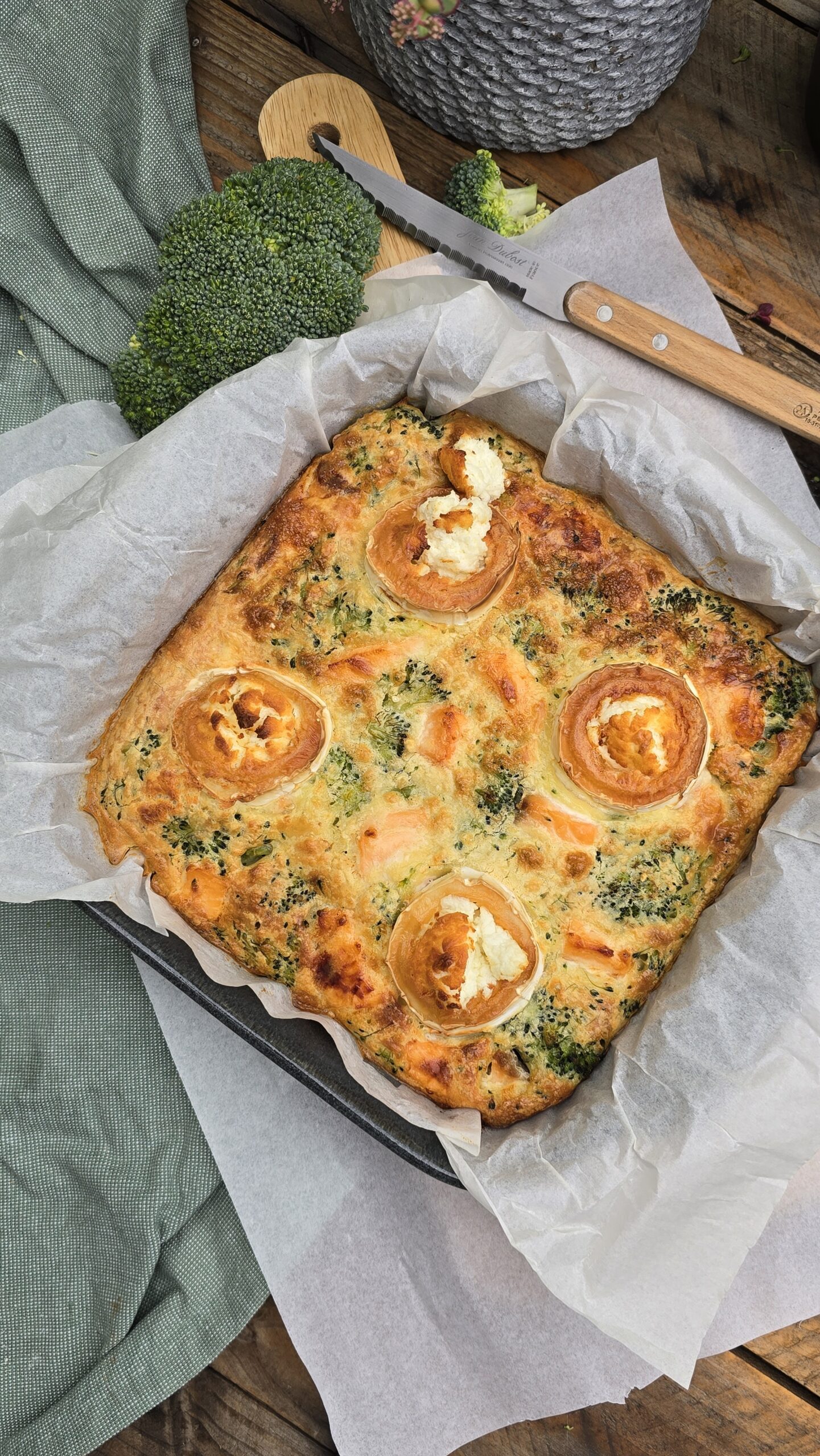 Dans un plat carré recouvert d’un papier cuisson, déposez le brocolis cuit au fond, puis les dés de saumon cru. Versez l’appareil pardessus, bien repartir partout.