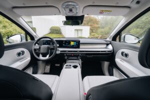 Oui, le Ioniq 9 se positionne au-dessus du Santa Fe thermique, à peine moins pachydermique avec ses 4,83 mètres de long. Il a d’ailleurs un cousin au sein du groupe Hyundai Motors, le Kia EV9, tout aussi imposant et utilisant les mêmes éléments techniques. On vous laisse statuer sur son design, lui qui affiche un style pour le moins « personnel » avec un traitement à la fois assez simple et peu conventionnel des volumes. Visuellement, en tout cas, il paraît énorme. Et le conducteur, tout petit ! A l’intérieur, la vocation haut de gamme se ressent tout de suite. Même s’il reste du plastique dur sur les parties basses de la planche de bord, les habillages et les finitions sont flatteuses. Les places arrière sont dignes d’une limousine. Même les deux sièges additionnels du coffre restent utilisables.