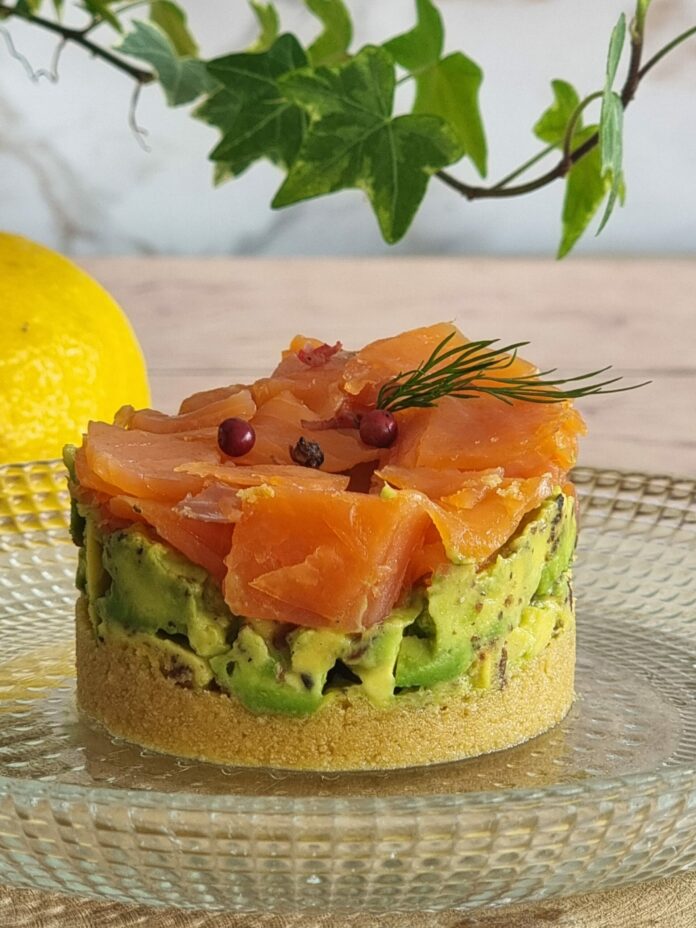 A l’aide d’un emporte-pièce de 7cm de diamètre, déposez au fond les biscuits mixés, tassez bien puis ajoutez l’avocat et terminez avec le saumon fumé.