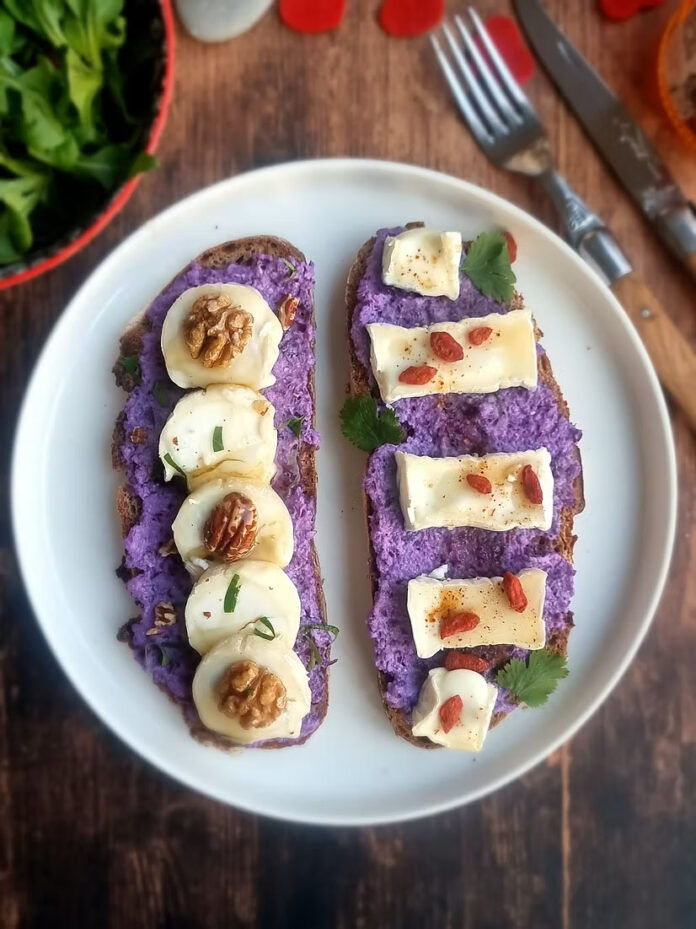 Réalisez tes tartines en commençant par étaler le caviar de chou rouge sur le pain, puis délicatement disposez le fromage, les fruits secs, arrosez d’un filet de miel, ajoutez les herbes fraîches (persil et coriandre), puis saupoudrez le piment d’Espelette sur la tartine avec l’ovale de chèvre.