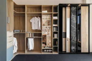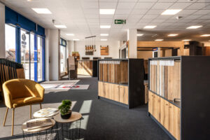 Deux entrées distinctes rythment désormais la visite. L’une d’elle dévoile la première spécialité de Siehr Benfeld : la menuiserie intérieure. 24 portes exposées, 60 références en revêtements de sol (stratifié, vinyle, parquet), placards et dressings du fabricant français Coulidoor et fenêtres, portes d’entrée et de garage… et un accès libre aux échantillons pour comparer, toucher, choisir en toute tranquillité.