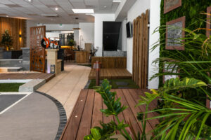 Du côté de la deuxième entrée, place à l’aménagement extérieur. Dalles, pavés, terrasses bois, clôtures et parements… le showroom aéré offre une vision complète des possibilités, avec des experts par domaine pour guider chaque projet.